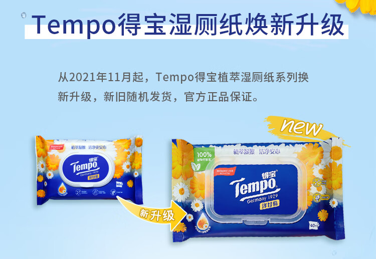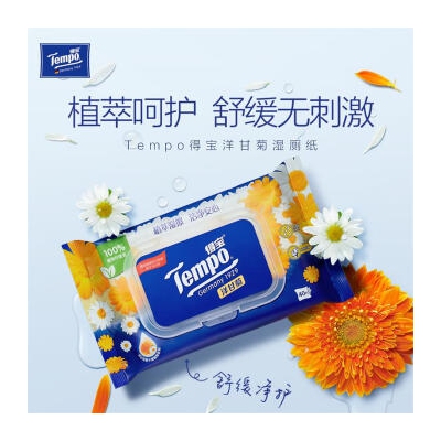商品名称:得宝(TEMPO)Tempo/得宝洋甘菊湿厕纸40片1包私处清洁不刺激卫生湿巾胶盖装